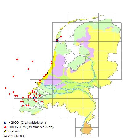 Het aantal atlasblokken (5x5 km) waarin de soort is gemeld binnen een periode van vijf jaar (vanaf 1980) of twintig jaar. Niet gecorrigeerd voor waarnemersinspanning en het aantal doorgegeven waarnemingen kan sterk variëren per periode, dus een trend in verspreiding kan hier niet direct uit worden afgelezen. Het opgegeven jaartal is het eerste jaar van de periode. Bron: gevalideerde waarnemingen uit de NDFF.