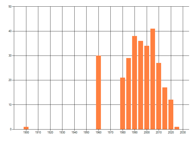 Het aantal atlasblokken (5x5 km) waarin de soort is gemeld binnen een periode van vijf jaar (vanaf 1980) of twintig jaar. Niet gecorrigeerd voor waarnemersinspanning en het aantal doorgegeven waarnemingen kan sterk variëren per periode, dus een trend in verspreiding kan hier niet direct uit worden afgelezen. Het opgegeven jaartal is het eerste jaar van de periode. Bron: gevalideerde waarnemingen uit de NDFF.
