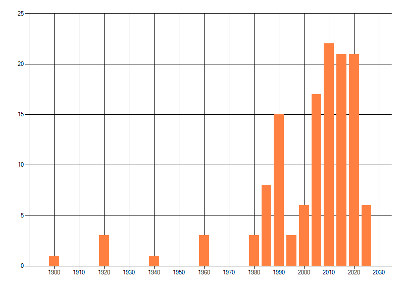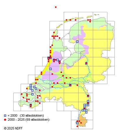 Het aantal atlasblokken (5x5 km) waarin de soort is gemeld binnen een periode van vijf jaar (vanaf 1980) of twintig jaar. Niet gecorrigeerd voor waarnemersinspanning en het aantal doorgegeven waarnemingen kan sterk variëren per periode, dus een trend in verspreiding kan hier niet direct uit worden afgelezen. Het opgegeven jaartal is het eerste jaar van de periode. Bron: gevalideerde waarnemingen uit de NDFF.