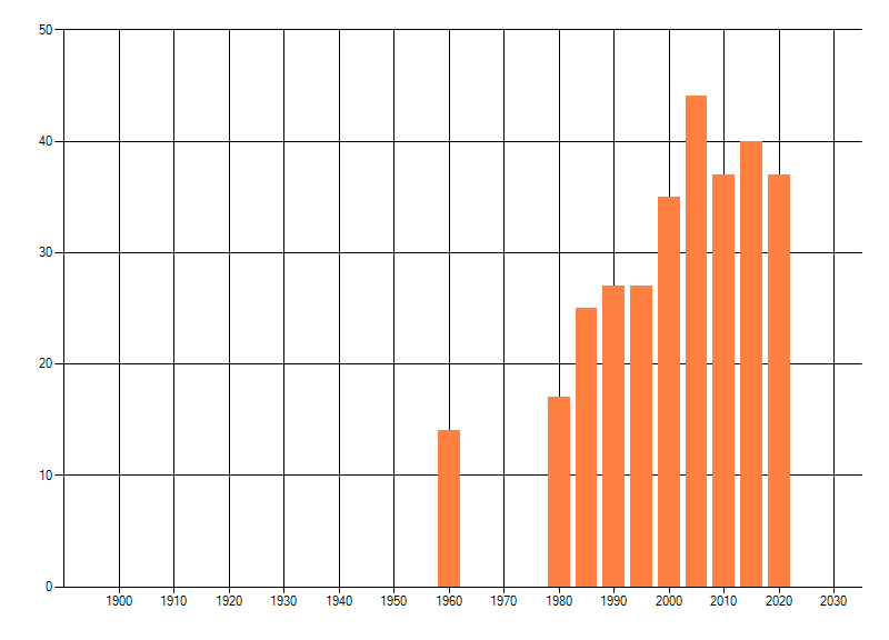 Het aantal atlasblokken (5x5 km) waarin de soort is gemeld binnen een periode van vijf jaar (vanaf 1980) of twintig jaar. Niet gecorrigeerd voor waarnemersinspanning en het aantal doorgegeven waarnemingen kan sterk variëren per periode, dus een trend in verspreiding kan hier niet direct uit worden afgelezen. Het opgegeven jaartal is het eerste jaar van de periode. Bron: gevalideerde waarnemingen uit de NDFF.