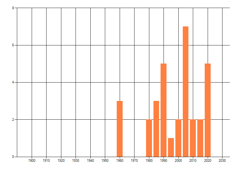 Het aantal atlasblokken (5x5 km) waarin de soort is gemeld binnen een periode van vijf jaar (vanaf 1980) of twintig jaar. Niet gecorrigeerd voor waarnemersinspanning en het aantal doorgegeven waarnemingen kan sterk variëren per periode, dus een trend in verspreiding kan hier niet direct uit worden afgelezen. Het opgegeven jaartal is het eerste jaar van de periode. Bron: gevalideerde waarnemingen uit de NDFF.
