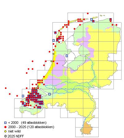 Het aantal atlasblokken (5x5 km) waarin de soort is gemeld binnen een periode van vijf jaar (vanaf 1980) of twintig jaar. Niet gecorrigeerd voor waarnemersinspanning en het aantal doorgegeven waarnemingen kan sterk variëren per periode, dus een trend in verspreiding kan hier niet direct uit worden afgelezen. Het opgegeven jaartal is het eerste jaar van de periode. Bron: gevalideerde waarnemingen uit de NDFF.