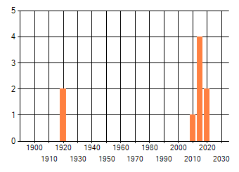 Het aantal atlasblokken (5x5 km) waarin de soort is gemeld binnen een periode van vijf jaar (vanaf 1980) of twintig jaar. Niet gecorrigeerd voor waarnemersinspanning en het aantal doorgegeven waarnemingen kan sterk variëren per periode, dus een trend in verspreiding kan hier niet direct uit worden afgelezen. Het opgegeven jaartal is het eerste jaar van de periode. Bron: gevalideerde waarnemingen uit de NDFF.