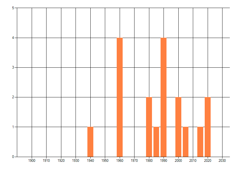 Het aantal atlasblokken (5x5 km) waarin de soort is gemeld binnen een periode van vijf jaar (vanaf 1980) of twintig jaar. Niet gecorrigeerd voor waarnemersinspanning en het aantal doorgegeven waarnemingen kan sterk variëren per periode, dus een trend in verspreiding kan hier niet direct uit worden afgelezen. Het opgegeven jaartal is het eerste jaar van de periode. Bron: gevalideerde waarnemingen uit de NDFF.
