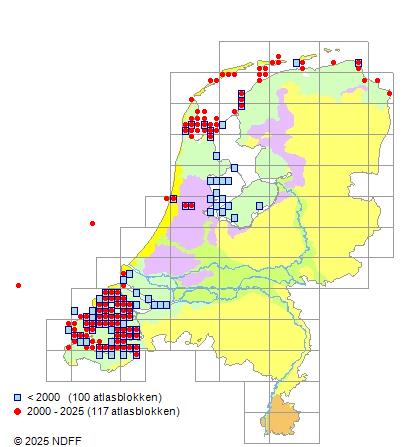 Het aantal atlasblokken (5x5 km) waarin de soort is gemeld binnen een periode van vijf jaar (vanaf 1980) of twintig jaar. Niet gecorrigeerd voor waarnemersinspanning en het aantal doorgegeven waarnemingen kan sterk variëren per periode, dus een trend in verspreiding kan hier niet direct uit worden afgelezen. Het opgegeven jaartal is het eerste jaar van de periode. Bron: gevalideerde waarnemingen uit de NDFF.