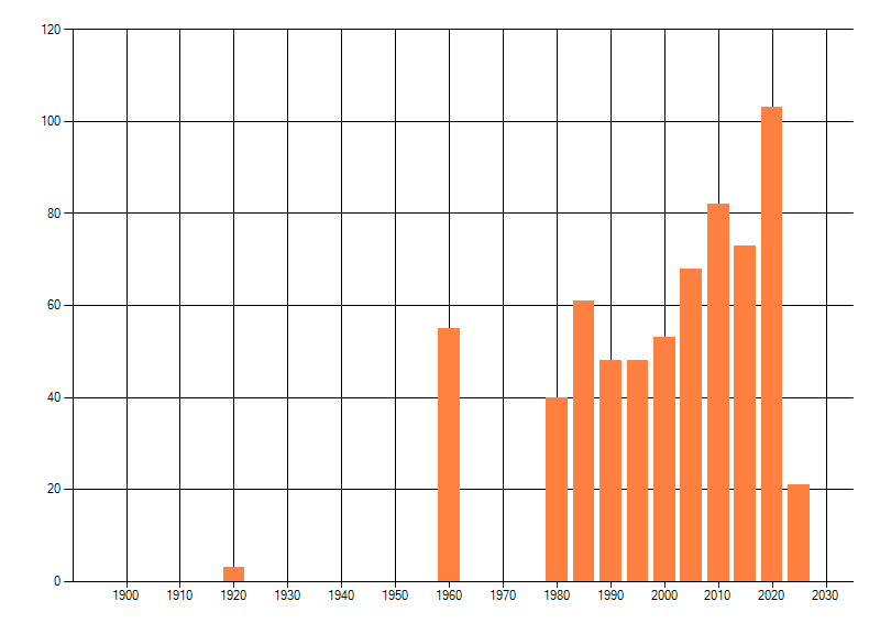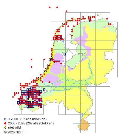 Het aantal atlasblokken (5x5 km) waarin de soort is gemeld binnen een periode van vijf jaar (vanaf 1980) of twintig jaar. Niet gecorrigeerd voor waarnemersinspanning en het aantal doorgegeven waarnemingen kan sterk variëren per periode, dus een trend in verspreiding kan hier niet direct uit worden afgelezen. Het opgegeven jaartal is het eerste jaar van de periode. Bron: gevalideerde waarnemingen uit de NDFF.