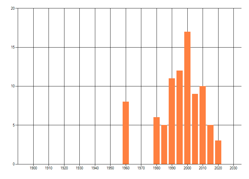 Het aantal atlasblokken (5x5 km) waarin de soort is gemeld binnen een periode van vijf jaar (vanaf 1980) of twintig jaar. Niet gecorrigeerd voor waarnemersinspanning en het aantal doorgegeven waarnemingen kan sterk variëren per periode, dus een trend in verspreiding kan hier niet direct uit worden afgelezen. Het opgegeven jaartal is het eerste jaar van de periode. Bron: gevalideerde waarnemingen uit de NDFF.