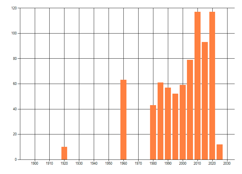 Het aantal atlasblokken (5x5 km) waarin de soort is gemeld binnen een periode van vijf jaar (vanaf 1980) of twintig jaar. Niet gecorrigeerd voor waarnemersinspanning en het aantal doorgegeven waarnemingen kan sterk variëren per periode, dus een trend in verspreiding kan hier niet direct uit worden afgelezen. Het opgegeven jaartal is het eerste jaar van de periode. Bron: gevalideerde waarnemingen uit de NDFF.