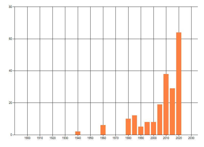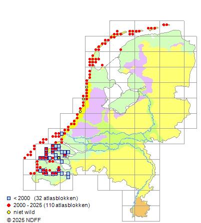 Het aantal atlasblokken (5x5 km) waarin de soort is gemeld binnen een periode van vijf jaar (vanaf 1980) of twintig jaar. Niet gecorrigeerd voor waarnemersinspanning en het aantal doorgegeven waarnemingen kan sterk variëren per periode, dus een trend in verspreiding kan hier niet direct uit worden afgelezen. Het opgegeven jaartal is het eerste jaar van de periode. Bron: gevalideerde waarnemingen uit de NDFF.