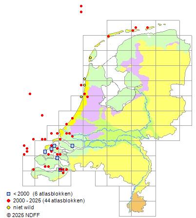 Het aantal atlasblokken (5x5 km) waarin de soort is gemeld binnen een periode van vijf jaar (vanaf 1980) of twintig jaar. Niet gecorrigeerd voor waarnemersinspanning en het aantal doorgegeven waarnemingen kan sterk variëren per periode, dus een trend in verspreiding kan hier niet direct uit worden afgelezen. Het opgegeven jaartal is het eerste jaar van de periode. Bron: gevalideerde waarnemingen uit de NDFF.