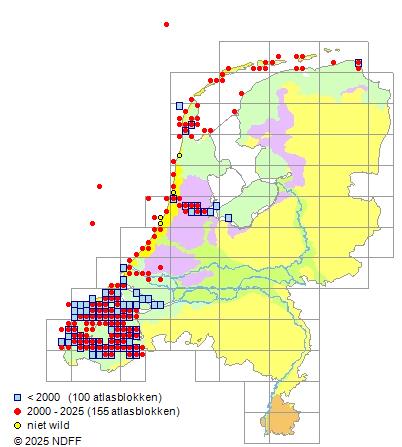 Het aantal atlasblokken (5x5 km) waarin de soort is gemeld binnen een periode van vijf jaar (vanaf 1980) of twintig jaar. Niet gecorrigeerd voor waarnemersinspanning en het aantal doorgegeven waarnemingen kan sterk variëren per periode, dus een trend in verspreiding kan hier niet direct uit worden afgelezen. Het opgegeven jaartal is het eerste jaar van de periode. Bron: gevalideerde waarnemingen uit de NDFF.
