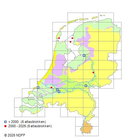 Het aantal atlasblokken (5x5 km) waarin de soort is gemeld binnen een periode van vijf jaar (vanaf 1980) of twintig jaar. Niet gecorrigeerd voor waarnemersinspanning en het aantal doorgegeven waarnemingen kan sterk variëren per periode, dus een trend in verspreiding kan hier niet direct uit worden afgelezen. Het opgegeven jaartal is het eerste jaar van de periode. Bron: gevalideerde waarnemingen uit de NDFF.