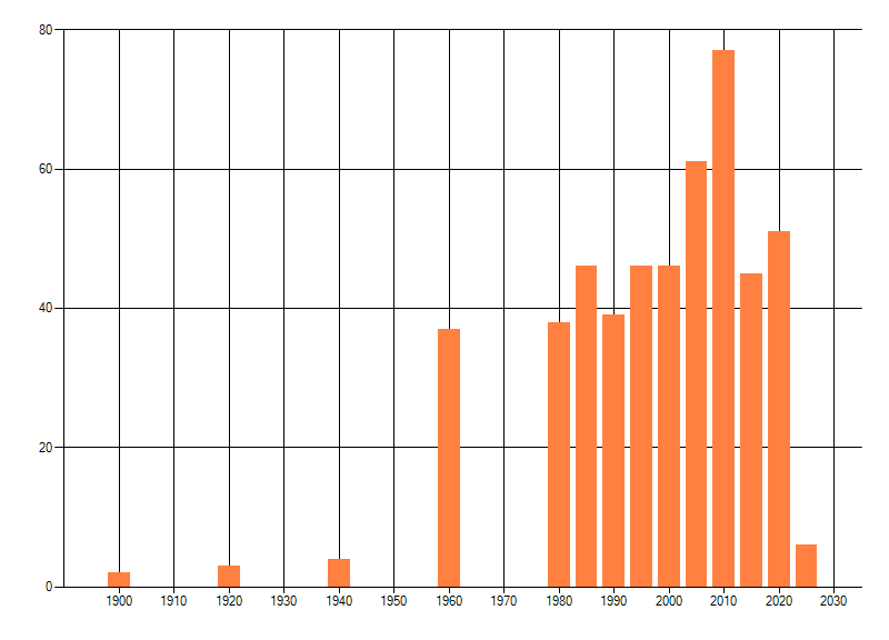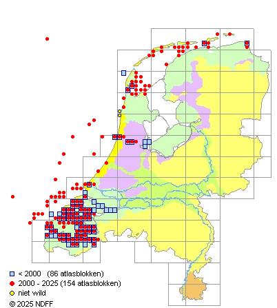 Het aantal atlasblokken (5x5 km) waarin de soort is gemeld binnen een periode van vijf jaar (vanaf 1980) of twintig jaar. Niet gecorrigeerd voor waarnemersinspanning en het aantal doorgegeven waarnemingen kan sterk variëren per periode, dus een trend in verspreiding kan hier niet direct uit worden afgelezen. Het opgegeven jaartal is het eerste jaar van de periode. Bron: gevalideerde waarnemingen uit de NDFF.