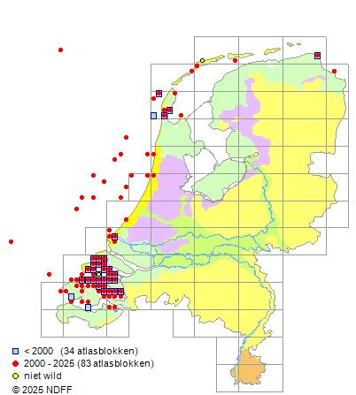 Het aantal atlasblokken (5x5 km) waarin de soort is gemeld binnen een periode van vijf jaar (vanaf 1980) of twintig jaar. Niet gecorrigeerd voor waarnemersinspanning en het aantal doorgegeven waarnemingen kan sterk variëren per periode, dus een trend in verspreiding kan hier niet direct uit worden afgelezen. Het opgegeven jaartal is het eerste jaar van de periode. Bron: gevalideerde waarnemingen uit de NDFF.