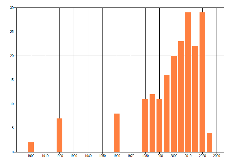 Het aantal atlasblokken (5x5 km) waarin de soort is gemeld binnen een periode van vijf jaar (vanaf 1980) of twintig jaar. Niet gecorrigeerd voor waarnemersinspanning en het aantal doorgegeven waarnemingen kan sterk variëren per periode, dus een trend in verspreiding kan hier niet direct uit worden afgelezen. Het opgegeven jaartal is het eerste jaar van de periode. Bron: gevalideerde waarnemingen uit de NDFF.
