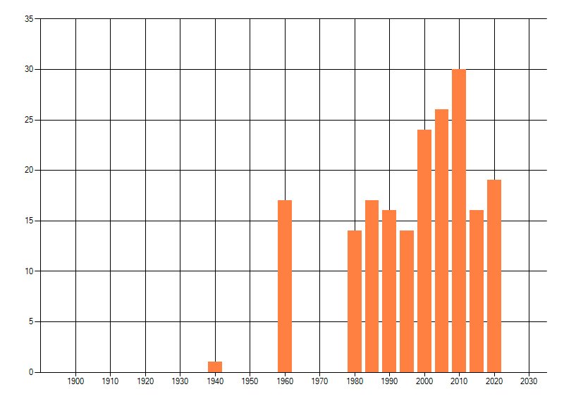 Het aantal atlasblokken (5x5 km) waarin de soort is gemeld binnen een periode van vijf jaar (vanaf 1980) of twintig jaar. Niet gecorrigeerd voor waarnemersinspanning en het aantal doorgegeven waarnemingen kan sterk variëren per periode, dus een trend in verspreiding kan hier niet direct uit worden afgelezen. Het opgegeven jaartal is het eerste jaar van de periode. Bron: gevalideerde waarnemingen uit de NDFF.