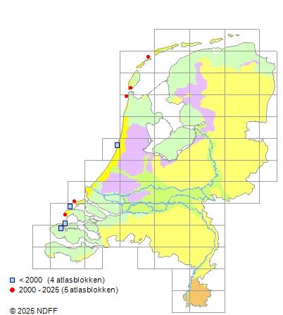 Het aantal atlasblokken (5x5 km) waarin de soort is gemeld binnen een periode van vijf jaar (vanaf 1980) of twintig jaar. Niet gecorrigeerd voor waarnemersinspanning en het aantal doorgegeven waarnemingen kan sterk variëren per periode, dus een trend in verspreiding kan hier niet direct uit worden afgelezen. Het opgegeven jaartal is het eerste jaar van de periode. Bron: gevalideerde waarnemingen uit de NDFF.
