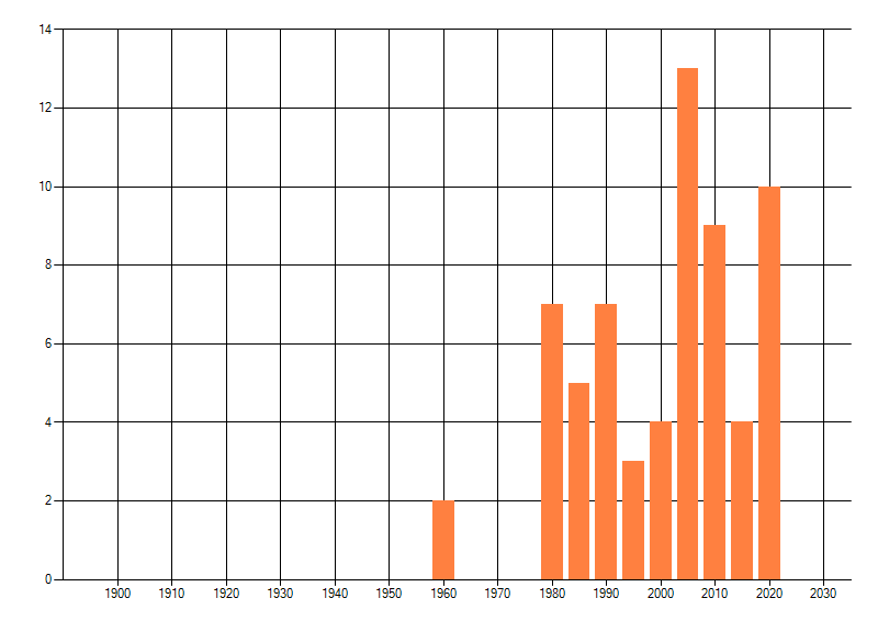 Het aantal atlasblokken (5x5 km) waarin de soort is gemeld binnen een periode van vijf jaar (vanaf 1980) of twintig jaar. Niet gecorrigeerd voor waarnemersinspanning en het aantal doorgegeven waarnemingen kan sterk variëren per periode, dus een trend in verspreiding kan hier niet direct uit worden afgelezen. Het opgegeven jaartal is het eerste jaar van de periode. Bron: gevalideerde waarnemingen uit de NDFF.