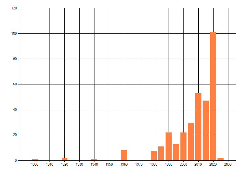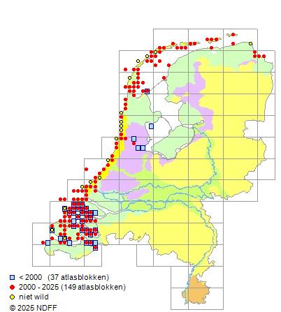 Het aantal atlasblokken (5x5 km) waarin de soort is gemeld binnen een periode van vijf jaar (vanaf 1980) of twintig jaar. Niet gecorrigeerd voor waarnemersinspanning en het aantal doorgegeven waarnemingen kan sterk variëren per periode, dus een trend in verspreiding kan hier niet direct uit worden afgelezen. Het opgegeven jaartal is het eerste jaar van de periode. Bron: gevalideerde waarnemingen uit de NDFF.