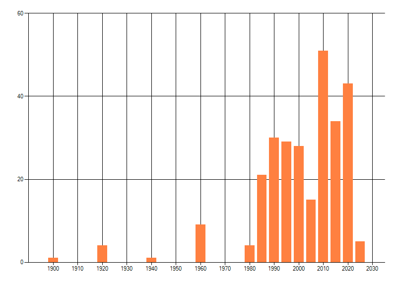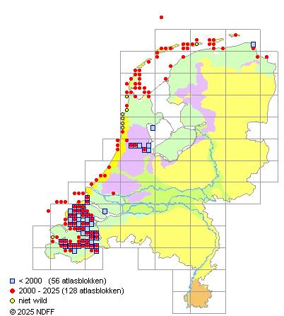 Het aantal atlasblokken (5x5 km) waarin de soort is gemeld binnen een periode van vijf jaar (vanaf 1980) of twintig jaar. Niet gecorrigeerd voor waarnemersinspanning en het aantal doorgegeven waarnemingen kan sterk variëren per periode, dus een trend in verspreiding kan hier niet direct uit worden afgelezen. Het opgegeven jaartal is het eerste jaar van de periode. Bron: gevalideerde waarnemingen uit de NDFF.