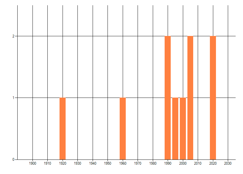 Het aantal atlasblokken (5x5 km) waarin de soort is gemeld binnen een periode van vijf jaar (vanaf 1980) of twintig jaar. Niet gecorrigeerd voor waarnemersinspanning en het aantal doorgegeven waarnemingen kan sterk variëren per periode, dus een trend in verspreiding kan hier niet direct uit worden afgelezen. Het opgegeven jaartal is het eerste jaar van de periode. Bron: gevalideerde waarnemingen uit de NDFF.