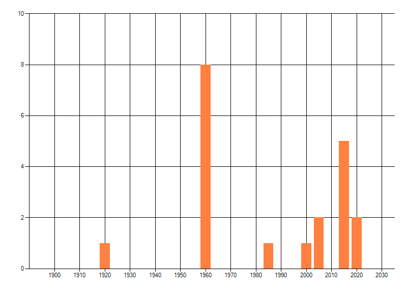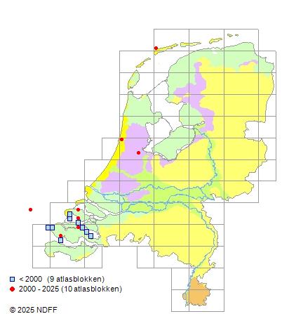 Het aantal atlasblokken (5x5 km) waarin de soort is gemeld binnen een periode van vijf jaar (vanaf 1980) of twintig jaar. Niet gecorrigeerd voor waarnemersinspanning en het aantal doorgegeven waarnemingen kan sterk variëren per periode, dus een trend in verspreiding kan hier niet direct uit worden afgelezen. Het opgegeven jaartal is het eerste jaar van de periode. Bron: gevalideerde waarnemingen uit de NDFF.