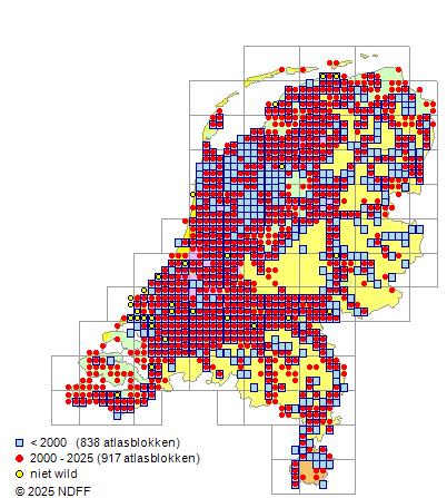 Het aantal atlasblokken (5x5 km) waarin de soort is gemeld binnen een periode van vijf jaar (vanaf 1980) of twintig jaar. Niet gecorrigeerd voor waarnemersinspanning en het aantal doorgegeven waarnemingen kan sterk variëren per periode, dus een trend in verspreiding kan hier niet direct uit worden afgelezen. Het opgegeven jaartal is het eerste jaar van de periode. Bron: gevalideerde waarnemingen uit de NDFF.