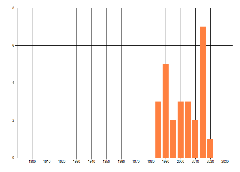 Het aantal atlasblokken (5x5 km) waarin de soort is gemeld binnen een periode van vijf jaar (vanaf 1980) of twintig jaar. Niet gecorrigeerd voor waarnemersinspanning en het aantal doorgegeven waarnemingen kan sterk variëren per periode, dus een trend in verspreiding kan hier niet direct uit worden afgelezen. Het opgegeven jaartal is het eerste jaar van de periode. Bron: gevalideerde waarnemingen uit de NDFF.