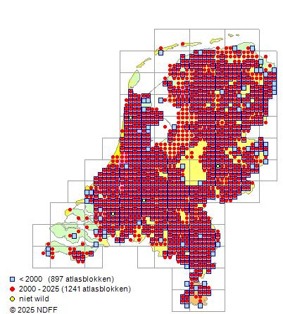 Het aantal atlasblokken (5x5 km) waarin de soort is gemeld binnen een periode van vijf jaar (vanaf 1980) of twintig jaar. Niet gecorrigeerd voor waarnemersinspanning en het aantal doorgegeven waarnemingen kan sterk variëren per periode, dus een trend in verspreiding kan hier niet direct uit worden afgelezen. Het opgegeven jaartal is het eerste jaar van de periode. Bron: gevalideerde waarnemingen uit de NDFF.