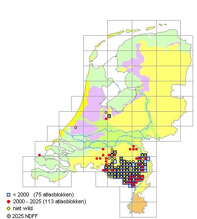 Het aantal atlasblokken (5x5 km) waarin de soort is gemeld binnen een periode van vijf jaar (vanaf 1980) of twintig jaar. Niet gecorrigeerd voor waarnemersinspanning en het aantal doorgegeven waarnemingen kan sterk variëren per periode, dus een trend in verspreiding kan hier niet direct uit worden afgelezen. Het opgegeven jaartal is het eerste jaar van de periode. Bron: gevalideerde waarnemingen uit de NDFF.