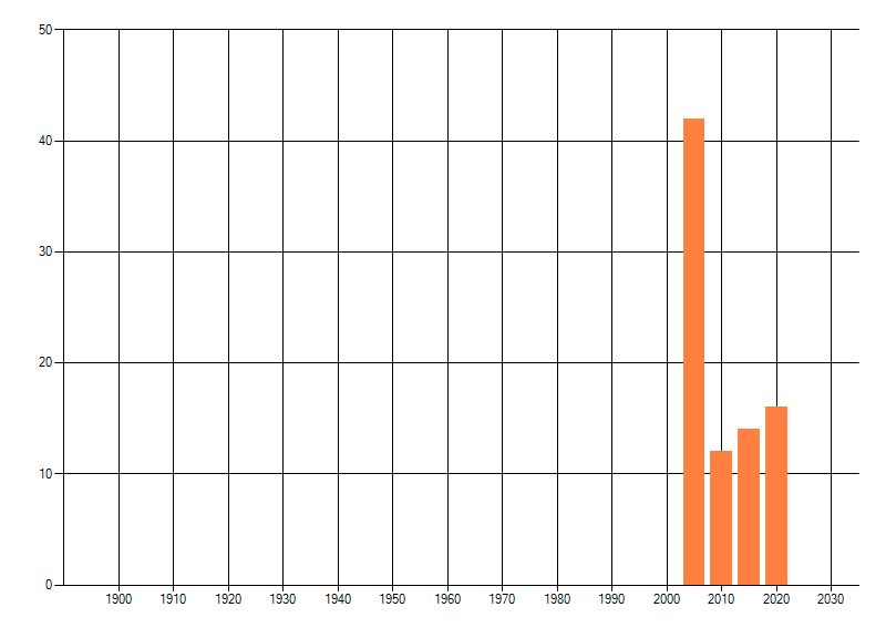 Het aantal atlasblokken (5x5 km) waarin de soort is gemeld binnen een periode van vijf jaar (vanaf 1980) of twintig jaar. Niet gecorrigeerd voor waarnemersinspanning en het aantal doorgegeven waarnemingen kan sterk variëren per periode, dus een trend in verspreiding kan hier niet direct uit worden afgelezen. Het opgegeven jaartal is het eerste jaar van de periode. Bron: gevalideerde waarnemingen uit de NDFF.