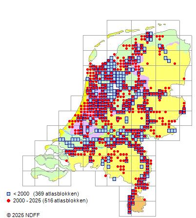 Het aantal atlasblokken (5x5 km) waarin de soort is gemeld binnen een periode van vijf jaar (vanaf 1980) of twintig jaar. Niet gecorrigeerd voor waarnemersinspanning en het aantal doorgegeven waarnemingen kan sterk variëren per periode, dus een trend in verspreiding kan hier niet direct uit worden afgelezen. Het opgegeven jaartal is het eerste jaar van de periode. Bron: gevalideerde waarnemingen uit de NDFF.