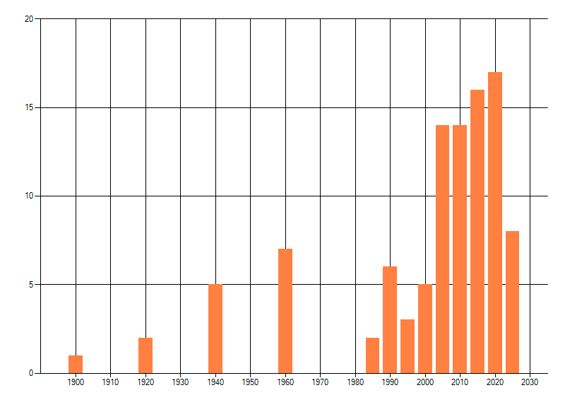 Het aantal atlasblokken (5x5 km) waarin de soort is gemeld binnen een periode van vijf jaar (vanaf 1980) of twintig jaar. Niet gecorrigeerd voor waarnemersinspanning en het aantal doorgegeven waarnemingen kan sterk variëren per periode, dus een trend in verspreiding kan hier niet direct uit worden afgelezen. Het opgegeven jaartal is het eerste jaar van de periode. Bron: gevalideerde waarnemingen uit de NDFF.