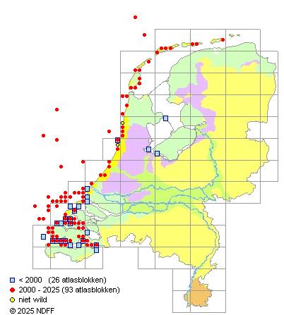 Het aantal atlasblokken (5x5 km) waarin de soort is gemeld binnen een periode van vijf jaar (vanaf 1980) of twintig jaar. Niet gecorrigeerd voor waarnemersinspanning en het aantal doorgegeven waarnemingen kan sterk variëren per periode, dus een trend in verspreiding kan hier niet direct uit worden afgelezen. Het opgegeven jaartal is het eerste jaar van de periode. Bron: gevalideerde waarnemingen uit de NDFF.