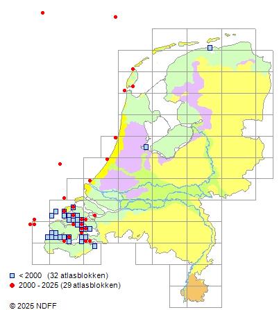 Het aantal atlasblokken (5x5 km) waarin de soort is gemeld binnen een periode van vijf jaar (vanaf 1980) of twintig jaar. Niet gecorrigeerd voor waarnemersinspanning en het aantal doorgegeven waarnemingen kan sterk variëren per periode, dus een trend in verspreiding kan hier niet direct uit worden afgelezen. Het opgegeven jaartal is het eerste jaar van de periode. Bron: gevalideerde waarnemingen uit de NDFF.
