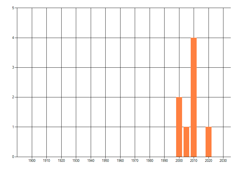 Het aantal atlasblokken (5x5 km) waarin de soort is gemeld binnen een periode van vijf jaar (vanaf 1980) of twintig jaar. Niet gecorrigeerd voor waarnemersinspanning en het aantal doorgegeven waarnemingen kan sterk variëren per periode, dus een trend in verspreiding kan hier niet direct uit worden afgelezen. Het opgegeven jaartal is het eerste jaar van de periode. Bron: gevalideerde waarnemingen uit de NDFF.