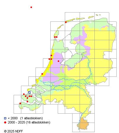Het aantal atlasblokken (5x5 km) waarin de soort is gemeld binnen een periode van vijf jaar (vanaf 1980) of twintig jaar. Niet gecorrigeerd voor waarnemersinspanning en het aantal doorgegeven waarnemingen kan sterk variëren per periode, dus een trend in verspreiding kan hier niet direct uit worden afgelezen. Het opgegeven jaartal is het eerste jaar van de periode. Bron: gevalideerde waarnemingen uit de NDFF.