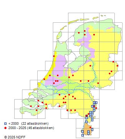 Het aantal atlasblokken (5x5 km) waarin de soort is gemeld binnen een periode van vijf jaar (vanaf 1980) of twintig jaar. Niet gecorrigeerd voor waarnemersinspanning en het aantal doorgegeven waarnemingen kan sterk variëren per periode, dus een trend in verspreiding kan hier niet direct uit worden afgelezen. Het opgegeven jaartal is het eerste jaar van de periode. Bron: gevalideerde waarnemingen uit de NDFF.