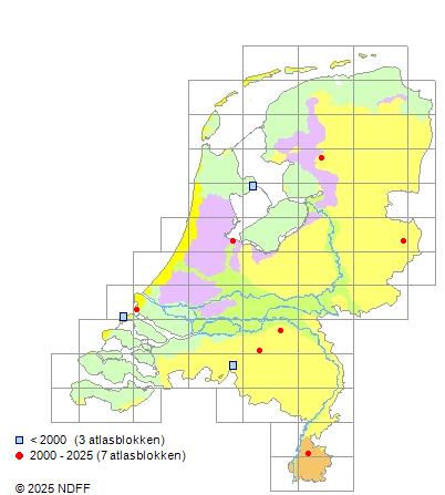 Het aantal atlasblokken (5x5 km) waarin de soort is gemeld binnen een periode van vijf jaar (vanaf 1980) of twintig jaar. Niet gecorrigeerd voor waarnemersinspanning en het aantal doorgegeven waarnemingen kan sterk variëren per periode, dus een trend in verspreiding kan hier niet direct uit worden afgelezen. Het opgegeven jaartal is het eerste jaar van de periode. Bron: gevalideerde waarnemingen uit de NDFF.