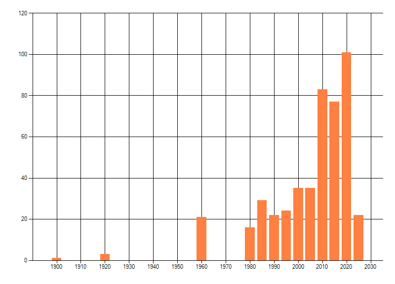 Het aantal atlasblokken (5x5 km) waarin de soort is gemeld binnen een periode van vijf jaar (vanaf 1980) of twintig jaar. Niet gecorrigeerd voor waarnemersinspanning en het aantal doorgegeven waarnemingen kan sterk variëren per periode, dus een trend in verspreiding kan hier niet direct uit worden afgelezen. Het opgegeven jaartal is het eerste jaar van de periode. Bron: gevalideerde waarnemingen uit de NDFF.