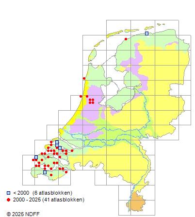 Het aantal atlasblokken (5x5 km) waarin de soort is gemeld binnen een periode van vijf jaar (vanaf 1980) of twintig jaar. Niet gecorrigeerd voor waarnemersinspanning en het aantal doorgegeven waarnemingen kan sterk variëren per periode, dus een trend in verspreiding kan hier niet direct uit worden afgelezen. Het opgegeven jaartal is het eerste jaar van de periode. Bron: gevalideerde waarnemingen uit de NDFF.