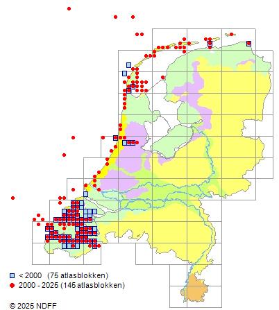 Het aantal atlasblokken (5x5 km) waarin de soort is gemeld binnen een periode van vijf jaar (vanaf 1980) of twintig jaar. Niet gecorrigeerd voor waarnemersinspanning en het aantal doorgegeven waarnemingen kan sterk variëren per periode, dus een trend in verspreiding kan hier niet direct uit worden afgelezen. Het opgegeven jaartal is het eerste jaar van de periode. Bron: gevalideerde waarnemingen uit de NDFF.