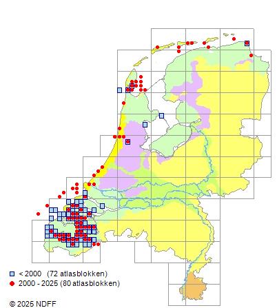 Het aantal atlasblokken (5x5 km) waarin de soort is gemeld binnen een periode van vijf jaar (vanaf 1980) of twintig jaar. Niet gecorrigeerd voor waarnemersinspanning en het aantal doorgegeven waarnemingen kan sterk variëren per periode, dus een trend in verspreiding kan hier niet direct uit worden afgelezen. Het opgegeven jaartal is het eerste jaar van de periode. Bron: gevalideerde waarnemingen uit de NDFF.