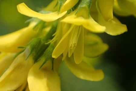 Bij de Citroengele honingklaver zijn de zwaarden een paar mm langer dan de kiel (foto links), bij Goudgele honingklaver zijn de zwaarden even langs als de kiel (foto rechts)