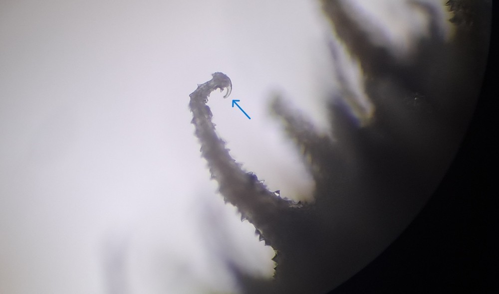 Detail van het 'weerhaakje' op de stekels van de splitvruchten van Akkerdoornzaad (Foto: Jaap Oosterom).