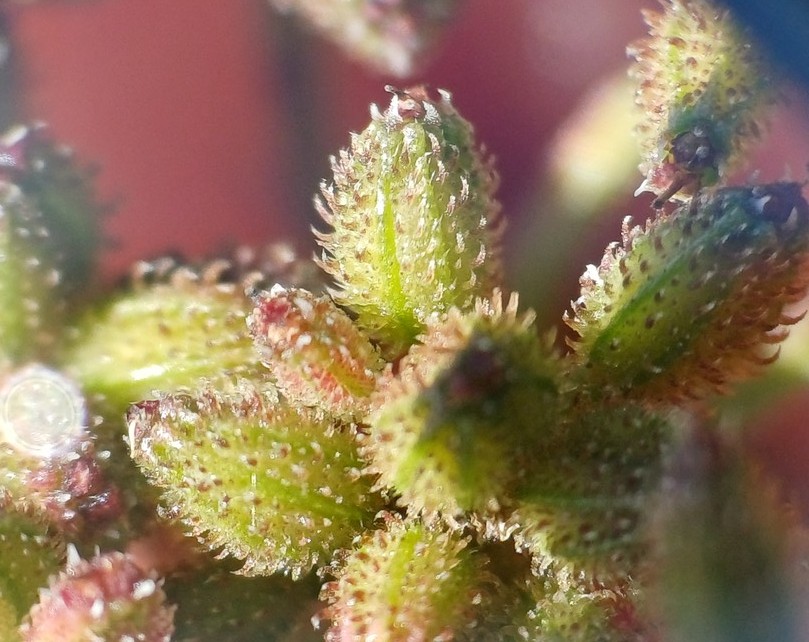 De splitvruchten van Akkerdoornzaad (links) en Heggendoornzaad (rechts) door een loep. Aan het uiteinde van de stekels is bij Akkerdoornzaad een minuscuul 'weerhaakje' te zien. Bij Heggendoornzaad krommen de stekels naar boven maar ontbreekt het weerhaakje (foto's: Stef van Walsum & Melissa Ramdayal).