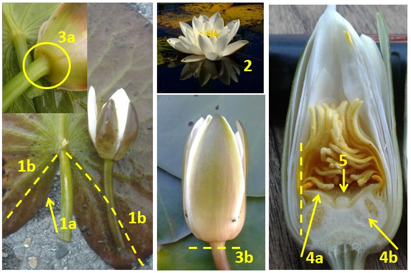 Fig. 2. Fotocollage Witte waterlelie met verduidelijking van de kenmerken: (1a) Basale bladslippen elkaar wel/niet overlappend, (1b) Hoofdnerf basale bladpunten recht en van elkaar wijkend, (2) stervormige bloem op water drijvend, (3a) bloembasis aan de onderzijde niet hol, (3b) bloembasis op zijaanzicht recht, (4) doorsnede stempelschijf (a) ongeveer even breed als doorsnede vruchtbeginsel (b), (5) centrale uitsteeksel even lang als breed.