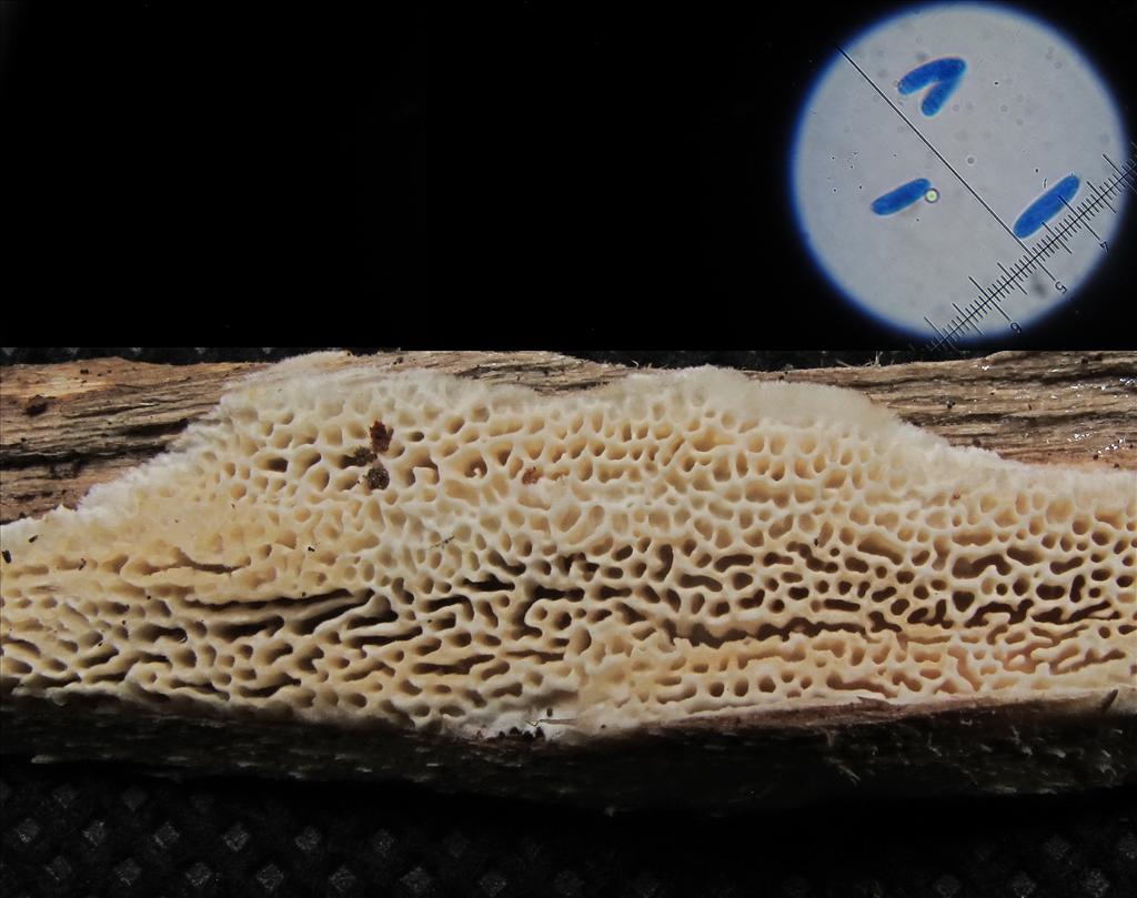 Resupinaat vruchtlichaam inzet: sporen (in katoenblauw)