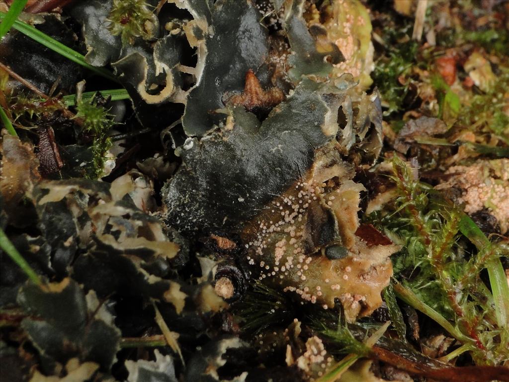 Parasiet op Peltigera hymenina (Kaal leermos)