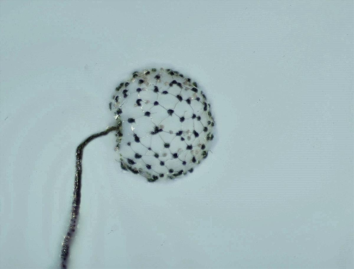 cribraria microcarpa in kweekbak op vermolmde Grove den, herbariumnummer "Plaisier 765", gecontroleerd door Hans van Hooff